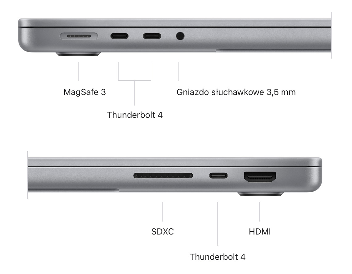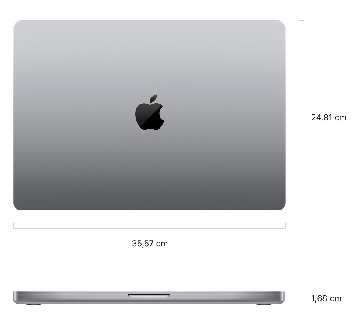 1. Wyświetlacze 14‑calowego i 16‑calowego MacBooka Pro mają zaokrąglone górne rogi. Przy założeniu, że powierzchnia ekranu jest prostokątem, jego przekątna wynosi odpowiednio 14,2 i 16,2 cala (faktyczny obszar wyświetlania jest mniejszy).