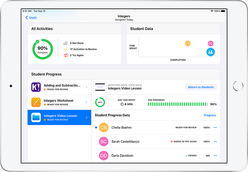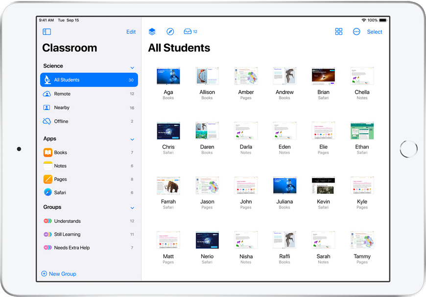 Aplikacja klasa daje nauczycielowi również możliwość wyświetlania ekranów uczniów na swoich urządzeniu, tablicy lub telewizorze w celu wspólnego omówienia zadań oraz prezentacji wybranych prac. Jeśli jest taka potrzeba, wszystkie iPady można w jednej chwili zablokować, aby uczniowie mogli skupić się na wykładowcy.