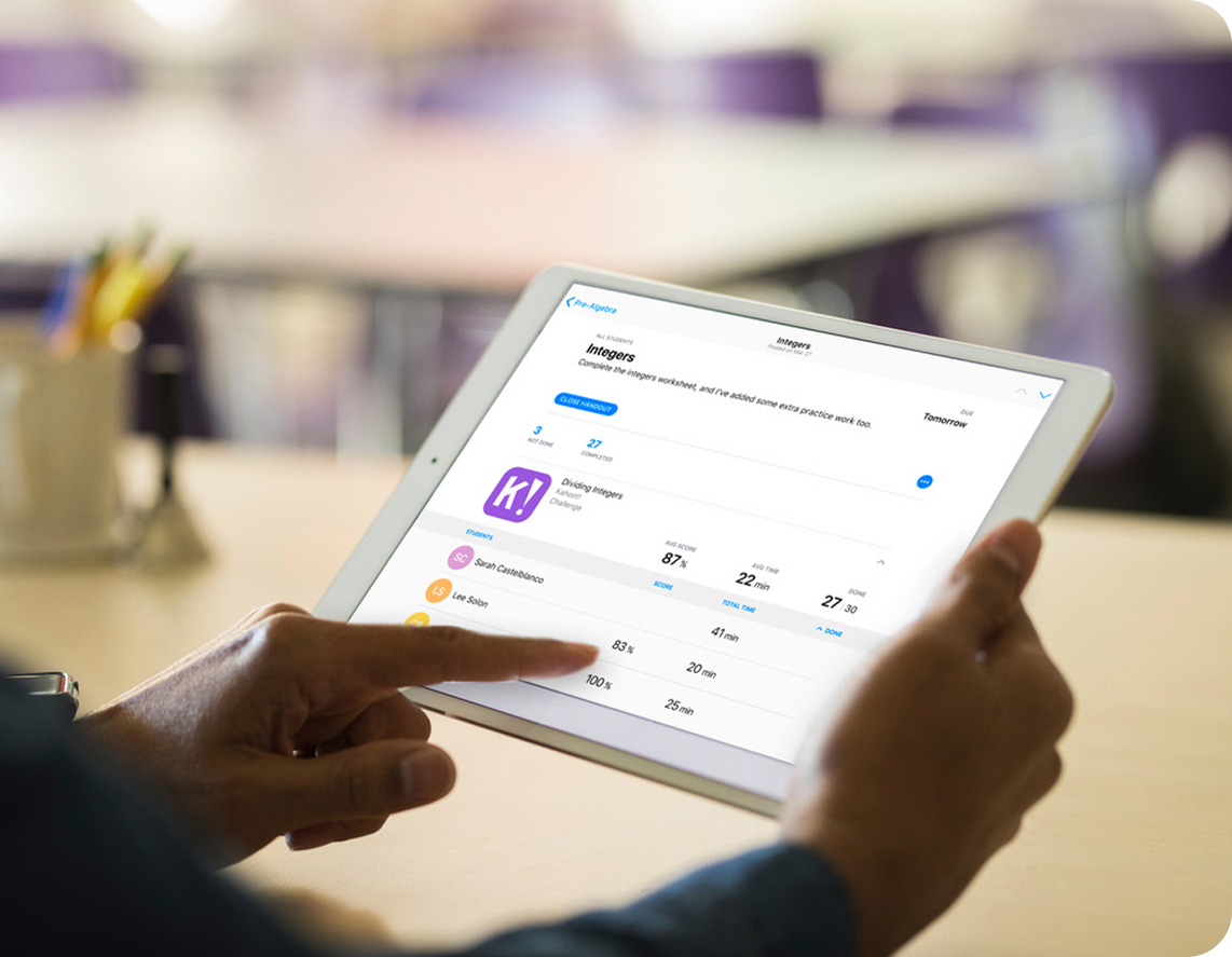 Aplikacja „klasa” to inteligentny asystent stworzony z myślą o nauczycielach. Pozwala on w prosty sposób organizować pracę uczniów na iPadach, monitorować ich postępy oraz łatwo dzielić się materiałami i kartami pracy w klasie.