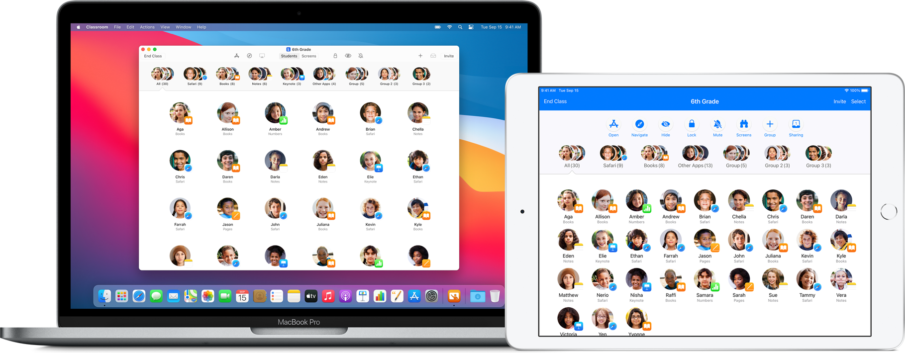 Aplikacje „klasa” i „zadane” można konfigurować w centralny sposób za pomocą narzędzia ASM oraz MDM, aby informacje o uczniach i klasach były aktualne. Zapewnia to nauczycielom komfort pracy i możliwość skupienia się wyłącznie na przeprowadzeniu zajęć.
