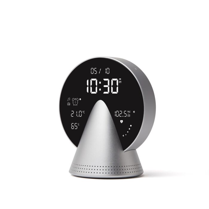 Lexon Conic Clock to designerski budzik z radiem FM i wbudowanym głośnikiem Bluetooth®, zaprojektowany przez Lidię Gómez. Łączy nowoczesną technologię z elegancką formą – aluminiowa, stożkowa podstawa i okrągły wyświetlacz LCD sprawiają, że urządzenie staje się stylowym elementem sypialni, biura lub salonu. Duży ekran prezentuje godzinę, temperaturę oraz wilgotność powietrza, zapewniając szybki dostęp do najważniejszych informacji.
