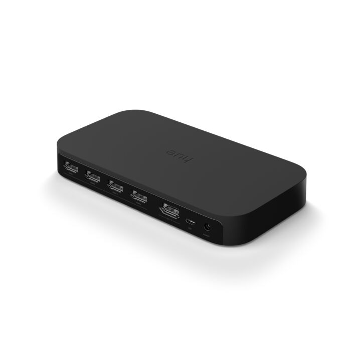 Podłącz urządzenia multimedialne — dekodery, wtyczki streamingowe, konsole do gier i więcej — do urządzenia Hue sync box, które automatycznie wykrywa, które wejście aktywnie odtwarza, i przełącza się na nie.