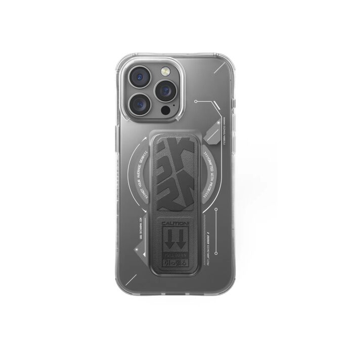 Skinarma Helio MagSafe Grip Stand to półprzezroczyste etui ochronne ze zintegrowaną, pełnowymiarową podstawką uchwytową i modułem pierścienia magnetycznego do ładowania bezprzewodowego, uzupełnione o wymienne pętle narożne do przymocowania smyczy.